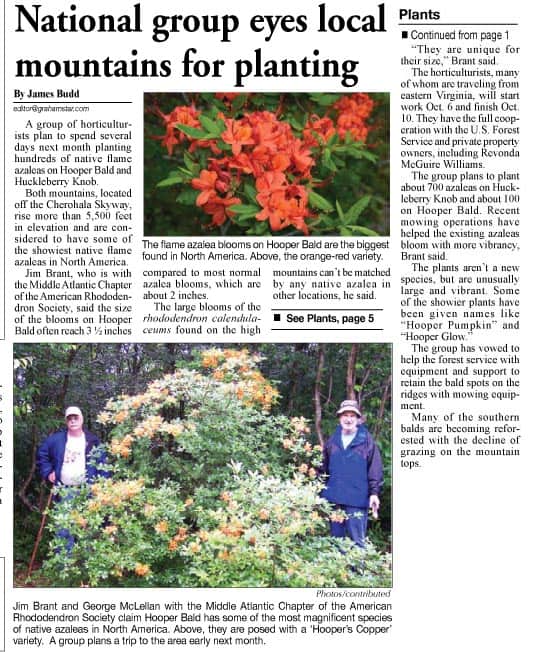We planted 700 azaleas in 4-6 inch pots on Huckleberry Ridge and 100 azaleas on Hooper Bald. These plants have been grown for us by the Southern Highlands Reserve from seed that was taken from the plants on Hooper Bald. This may be the largest amount of native azaleas to ever be plated in a native setting during one event.